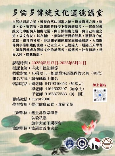 多伦多第一届道德讲堂将于5月17日到21号举办,尊敬的上成德法师等主讲,这是大家一起深入传统文化,共同学习的大好机会,16岁以上均可报名。请大家点击海报中的二维码🌹